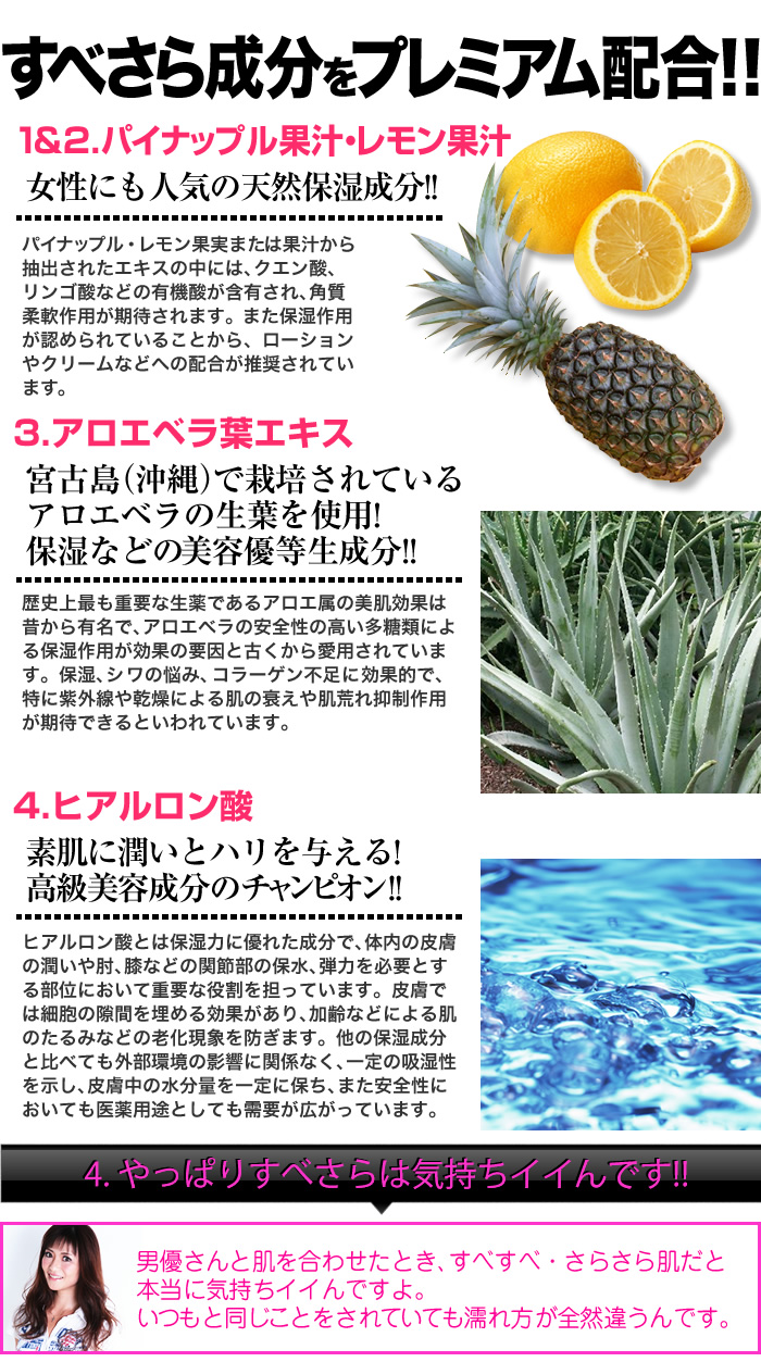 | 全成分 | 豆乳、水、パイナップル果汁、レモン果汁、エタノール、グリセリン、カキタンニン、チャ葉エキス、アロエベラ葉エキス、ヒアルロン酸Na、パパイン、ブロメライン、硫酸(Al/K)、香料、イランイラン花油、サンダルウッド木油、炭酸水素Na、EDTA-4Na、PPG-6デシルテトラデセス-30、炭酸Na、クロラミンT、フェノキシエタノール、BG |
